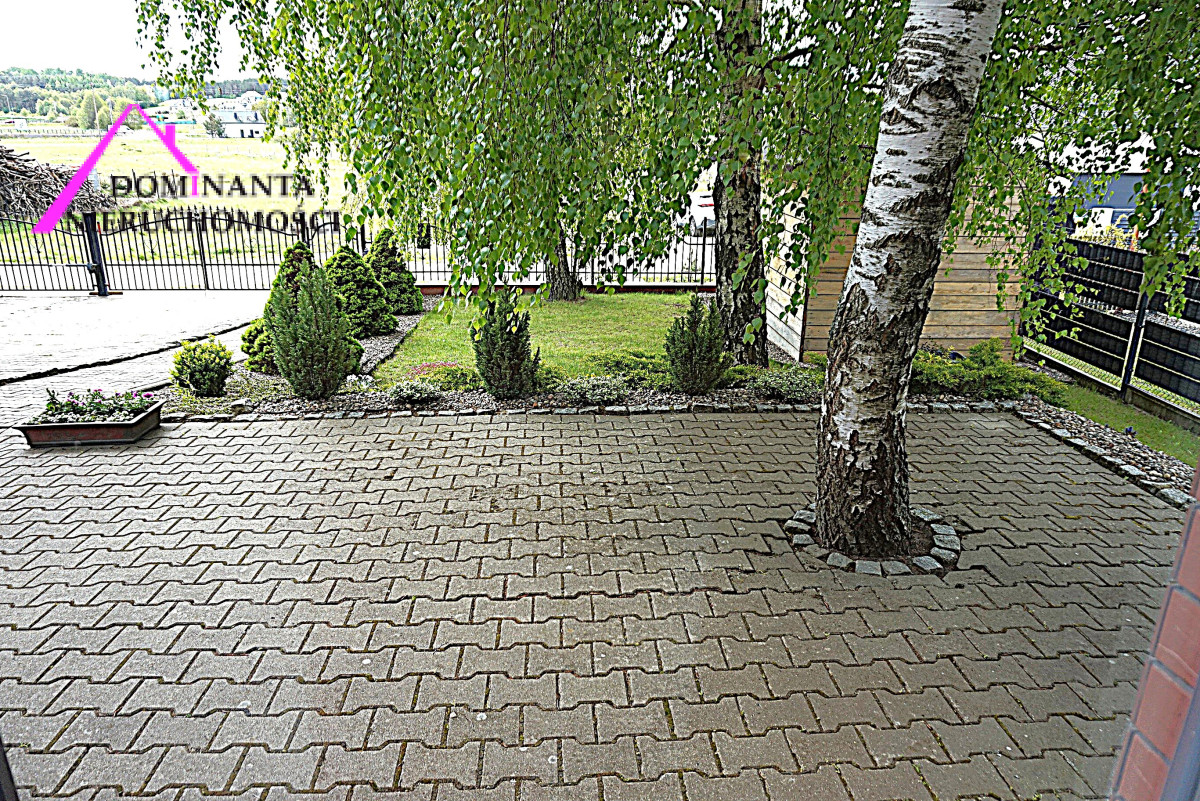 Przed domem mniejszy taras-kostka, zadbana zieleń oraz drzewa.