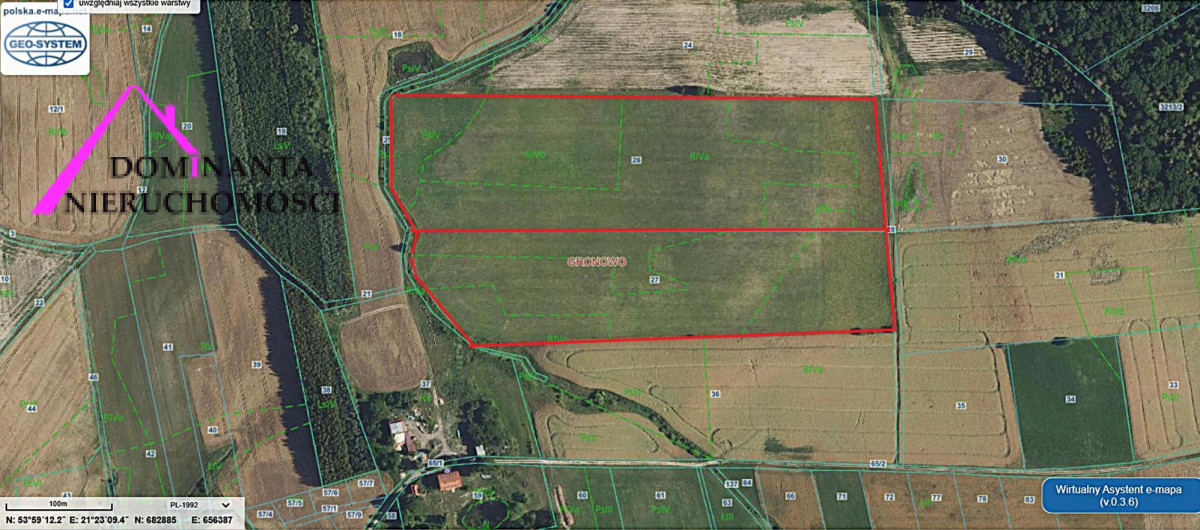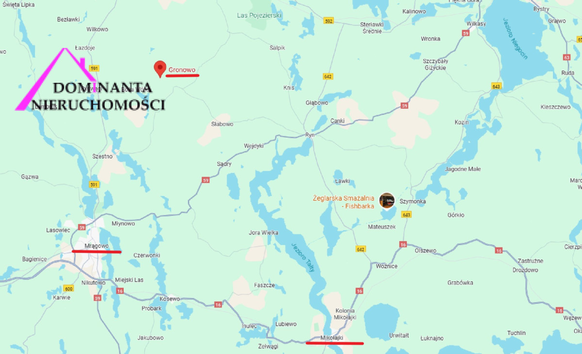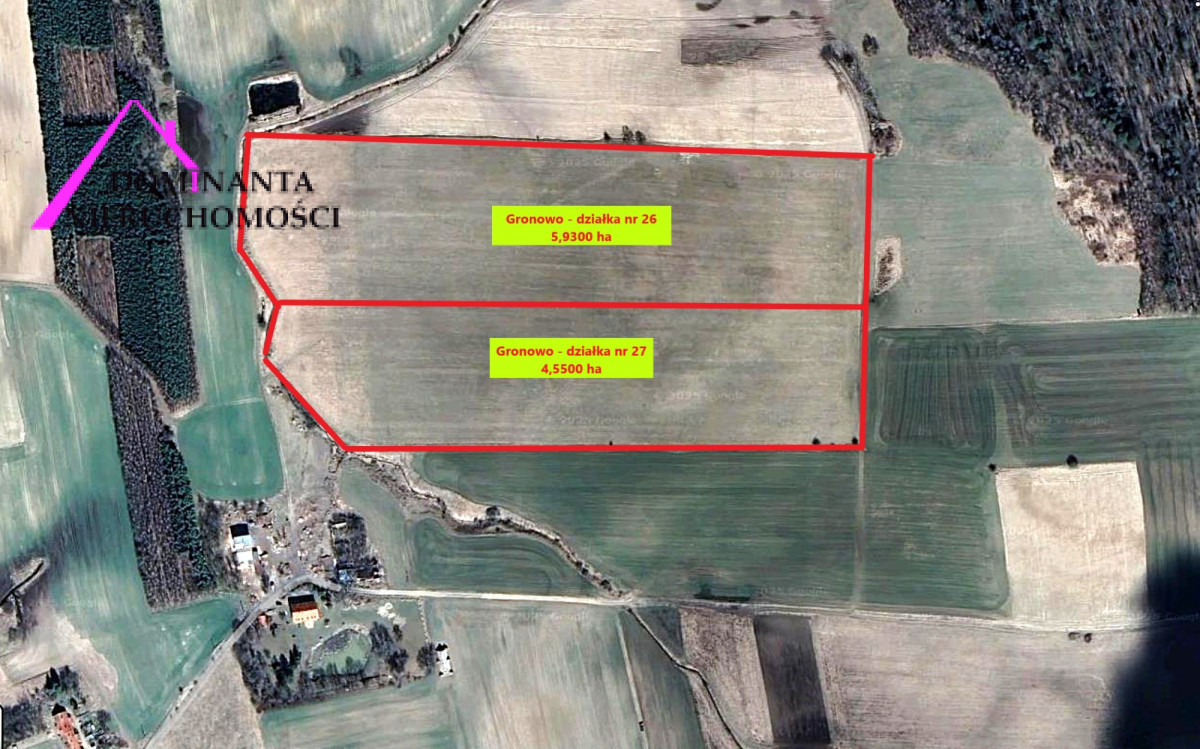 Dwie działki o powierzchni łącznej 10,4800 ha, położone w obrębie wsi Gronowo, w gminie Mrągowo, woj. warmińsko-mazurskie, w cichej okolicy, otoczone lasami i łąkami.