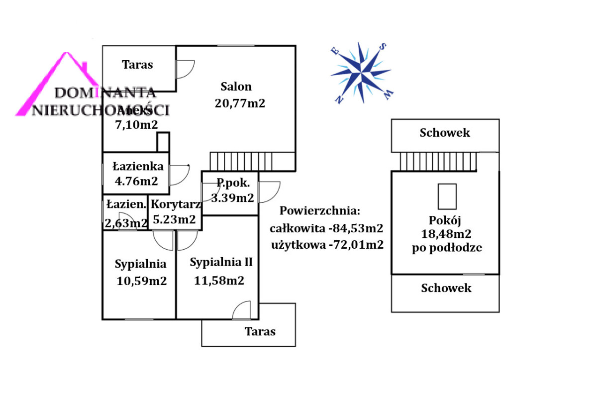 Dodatkowo dwa pomieszczenia gospodarcze na strychu(schowki) poza powierzchnią mieszkania.