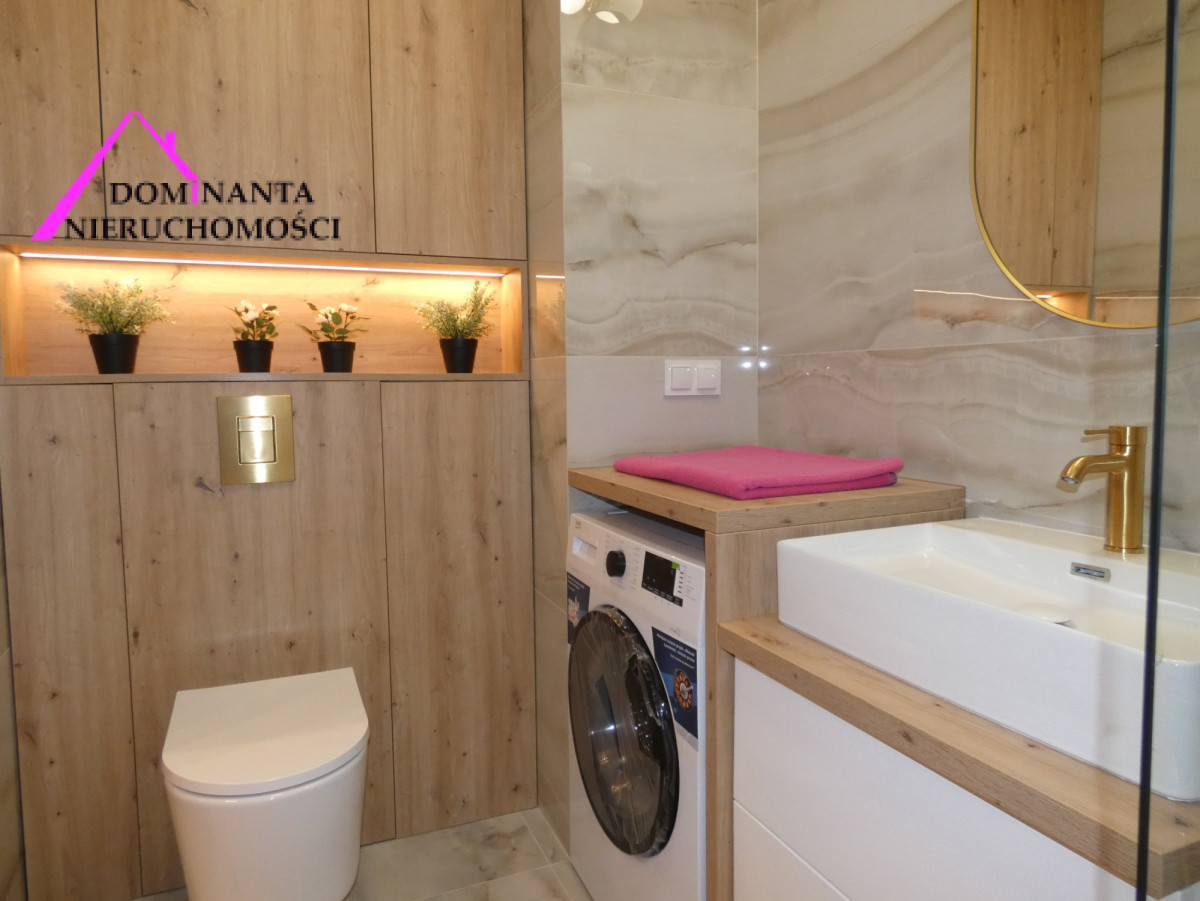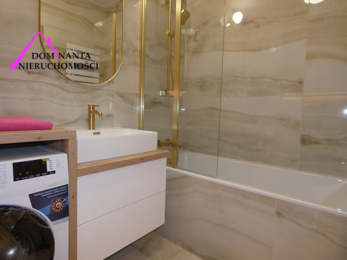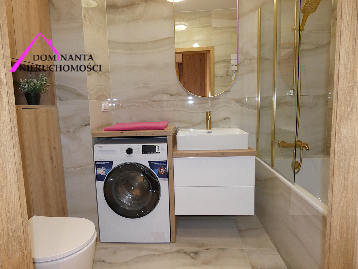 - łazienka - nowa zabudowa meblowa, szafka łazienkowa, obudowa pralki, pralka, wanna z funkcją prysznica (armatura Grohe).